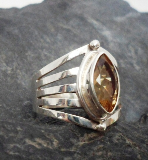 As it flares out along the side the silver is split into 5 sections. Along the center sits this beautiful Citrine that is set into a raise bezel. At each end of the bezel are 2 beads of silver.